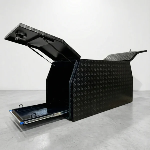 Built from durable 3mm black checker plate aluminium with full welded seams, this canopy is engineered for long-lasting strength and resilience. Its standout dual gullwing lid design provides wide, unobstructed access to your tools and equipment, each lid smoothly supported by reliable gas struts for effortless one-handed operation.